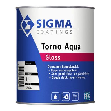 Sigma Torno Aqua Gloss is een watergedragen, hoogglanzende lakverf voor buiten. Sigma Torno Aqua Gloss is geschikt voor het voor- en aflakken van hout. Maar ook voor het aflakken van staal en non-ferrometalen die eerst op passende wijze zijn voorzien van een primersysteem en daarna zijn overgegrond met een geschikte grondverf.